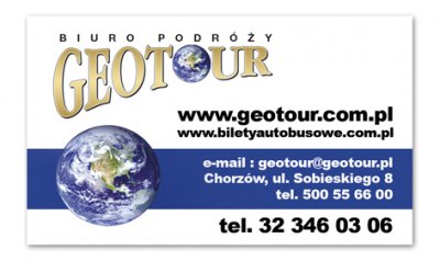 TEL 32-3460306, 500556600 Biuro Geotour Chorzów ul.Sobieskiego 8 - czynne 09-17.00 WWW.BILETYAUTOBUSOWE.COM.PL Rezerwacja tel, fax, mailem, sms-em, online lub w biurze z miasta Chorzów |